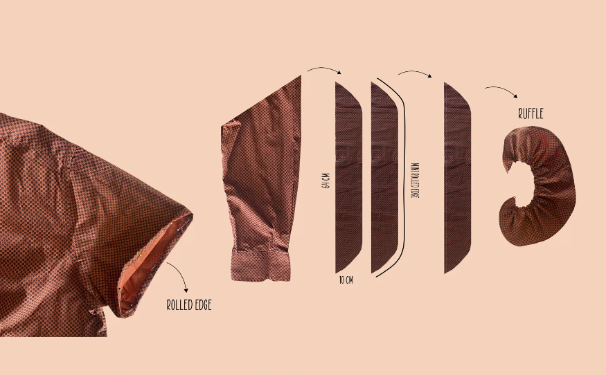 Coase volanele cu un spațiu de cusătură de 1 cm. Acum, îndoaie piesa pe cealaltă parte și fă o cusătură superioară pe volan pentru a te asigura că volanul cade frumos în lateral. Repetă pe cealaltă parte a cămășii.