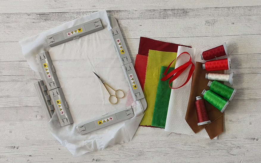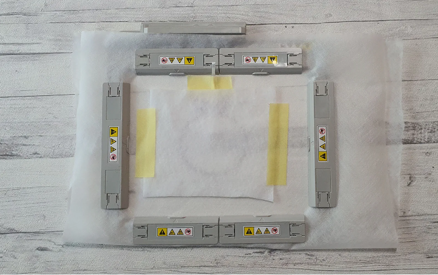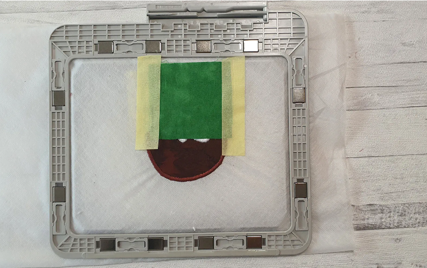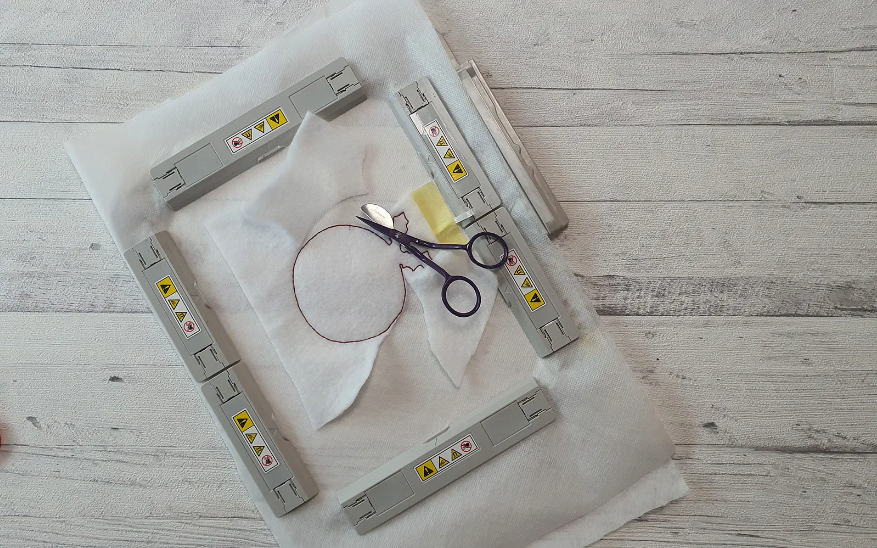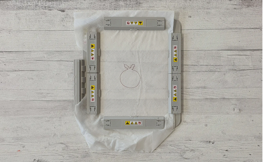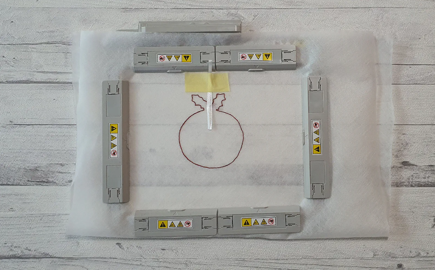 Prindeți in gherghef două straturi de material solubil în apă. Sfat: am folosit ghergheful magnetic de la Brother pentru acest proiect. Este mult mai ușor de atașat și previne deteriorarea țesăturii.