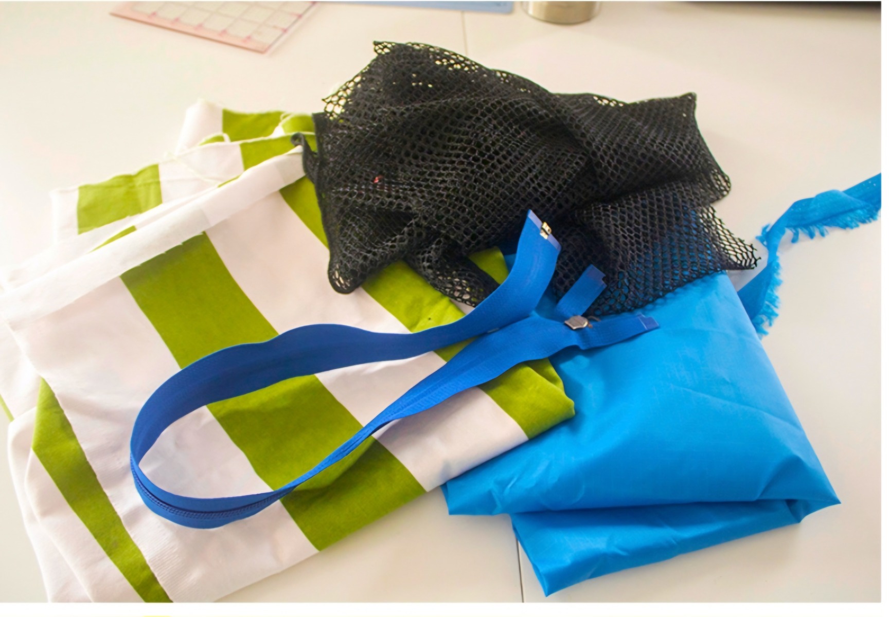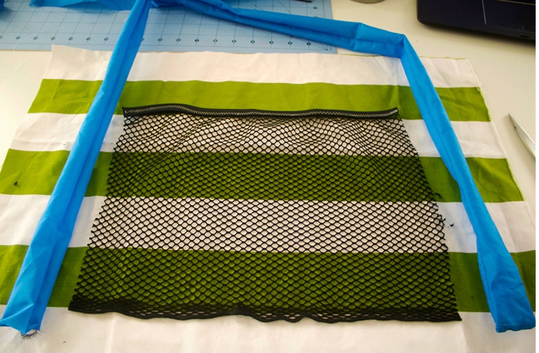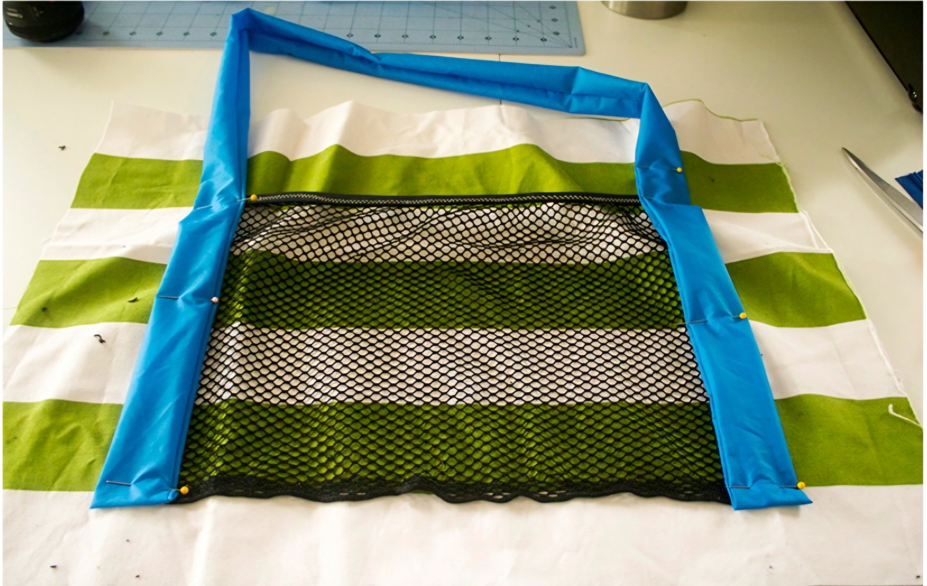 Coaseți în partea inferioară a buzunarelor și pe ambele părți ale curelei. Pe partea opusă a genții, acum vom crea buzunarul din plasă. Tăiați dimensiunile buzunarului la fel ca și celălalt buzunar. Tăiați pliul peste elastic cu 2" mai scurt decât partea superioară a buzunarelor.