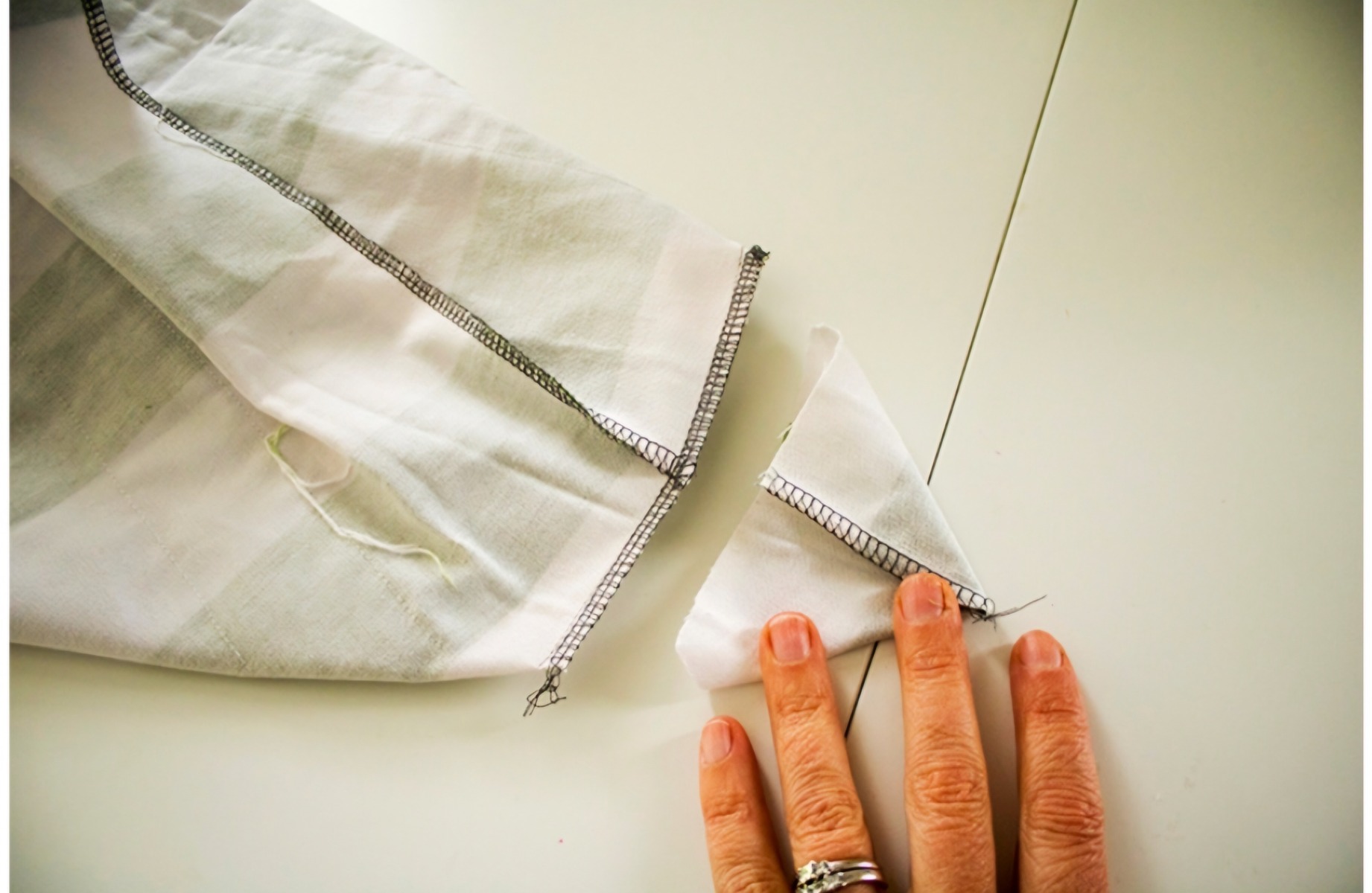 Îndoiți geanta astfel încât cusătura laterală să ajungă la un punct în partea de jos.